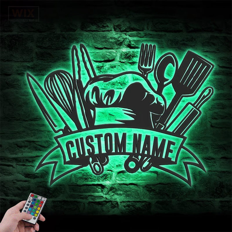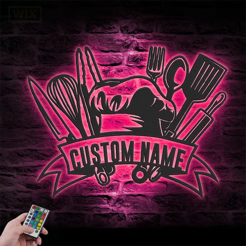 Custom Name Chef Tools Metal Wall Signs With RGB Led Light - WixDecor