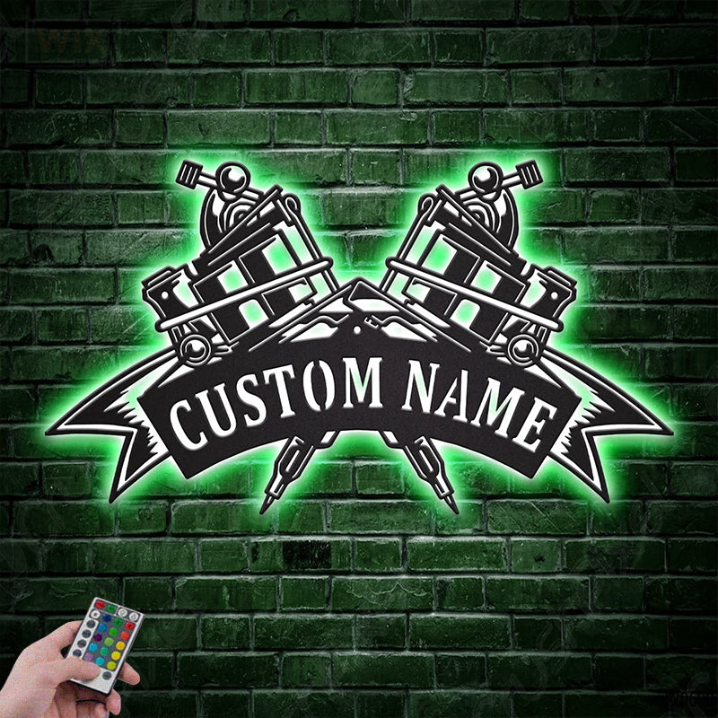 Custom Name Crossed Tattoo Machine Metal Wall Signs With RGB Led Light - WixDecor